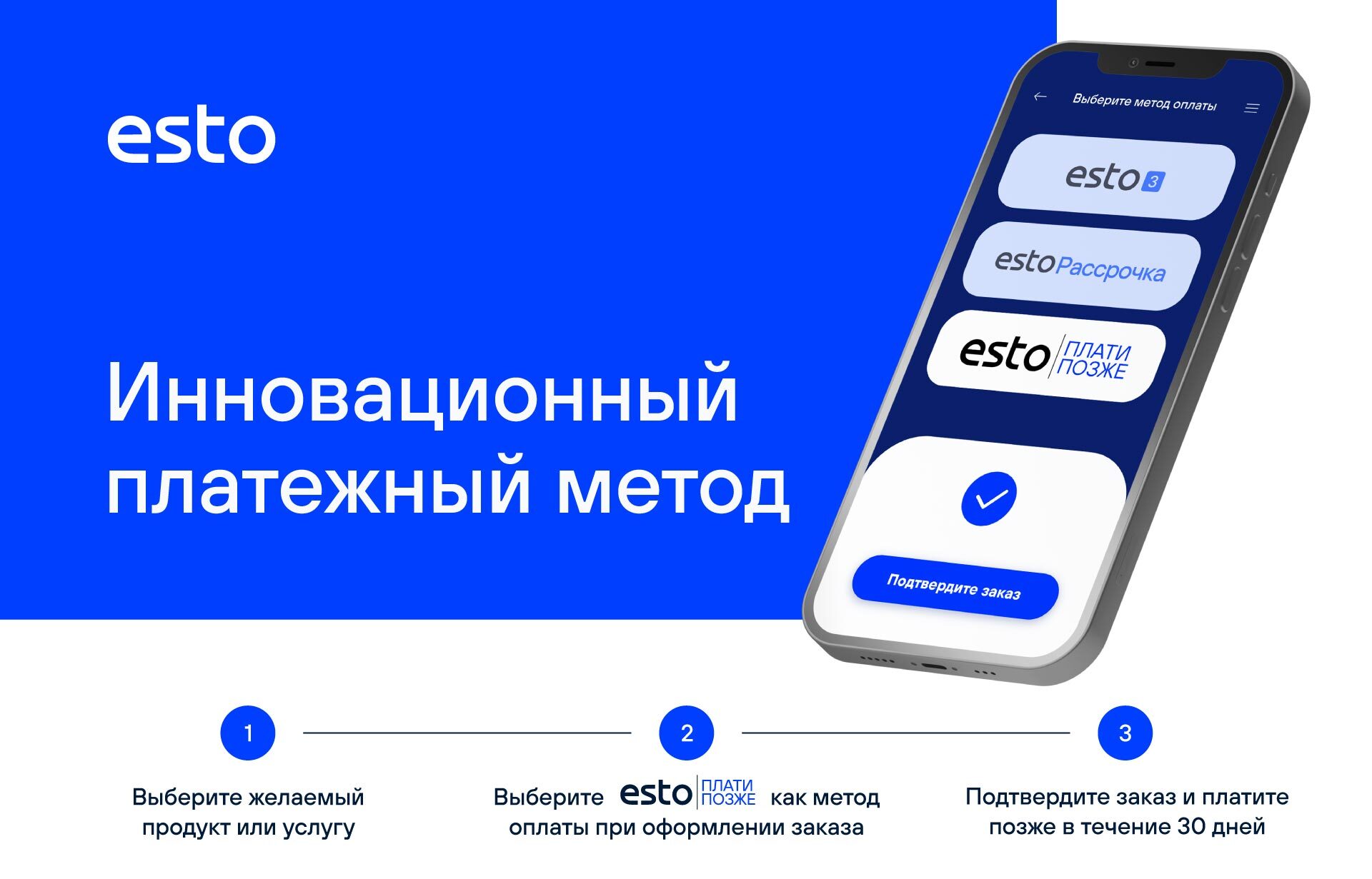 Платежный метод ESTO 3 - инновационное решение, которое позволяет подтвердить и оплатить покупку удобно и быстро - в три равных части без дополнительных сборов!